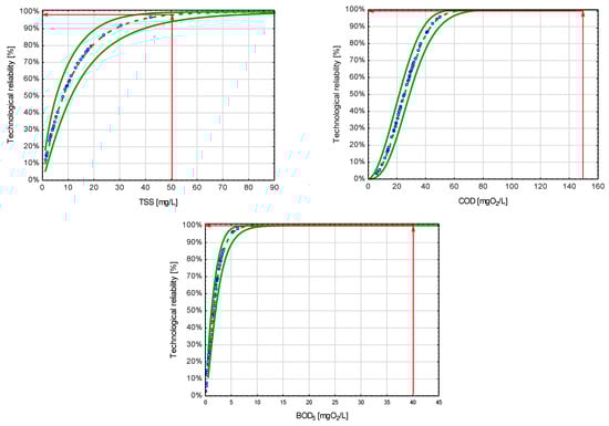 Reliability was determined from the distribution on the graphs, taking into account the normative values of the indicators, as specified in the Regulation of the Minister of Maritime and Inland Navigation [] for wastewater discharged from wastewater treatment plants up to 2000 PE: TSS—50 mg/L, BOD5—40 mgO2/L, and COD—150 mgO2/L. The reliability levels obtained were interpreted as the percentage of time that the expected pollutant concentrations in the treated wastewater were following accepted standards or treatment goals [,].