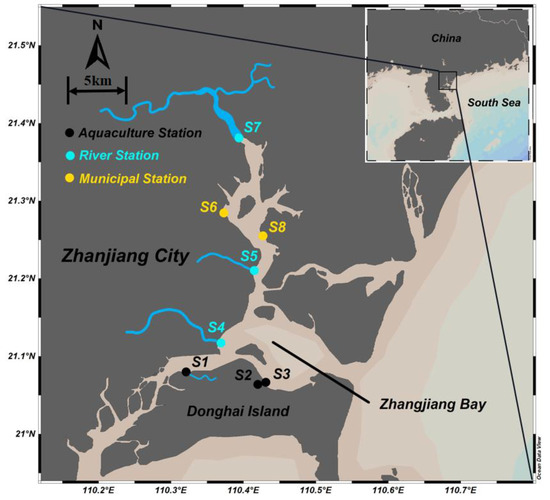 In this study, surface seawater samples were collected from the estuaries of 8 major rivers or flood discharge channels in ZJB in March 2021 (Figure 1). The sampling sites (S1–S8) were affected by residential areas, industrial zones, and aquaculture activities. Among them, S1–S3 were located at the north bank of Zhanjiang Donghai Island and were mainly affected by aquaculture wastewater discharge (S2 and S3 are situated in the same river, which is used for reservoir aquaculture flooding. The purpose of this is to test the internal and external pollution of the floodgates). S4 is at the estuary of the Nanliu River, located in the petrochemical industrial area, surrounded by the petrochemical wharf. S5 is at the Lvtang estuary in the urban residential area, a sewage estuary. S6 and S8 are in municipal sewers, and S7 is at the mouth of the largest river into ZJB, the Suixi River. Portable samplers were used to collect approximately 1.2 L of water samples, which were then stored in glass bottles with the addition of approximately 5 mL of methanol. The samples were stored in a refrigerator at 4 °C until further analysis. The oil content of the samples was determined using n-hexane liquid-liquid extraction/ultraviolet spectrophotometry according to the ‘Marine Monitoring Specification 2007’.