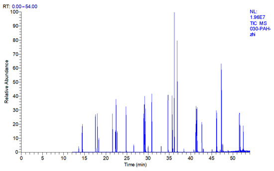 The samples were tested using gas chromatography/triple quadrupole mass spectrometry (Trace GC Ultra & TSQ Quantum XLS, Thermo Fisher, Waltham, MA, USA) for qualitative and quantitative analysis. The chromatographic column used was HP-5 ms (30 mm × 0.25 mm × 0.25 μm). PAHs and PAEs were detected simultaneously. The mass spectrometry mode for PAHs was selective reaction monitoring (SRM), while for PAEs it was selective ion monitoring (SIM). The temperature program for analysis consisted of an initial temperature of 70 °C for 2 min, followed by an increase to 290 °C at a rate of 5 °C/min for 10 min. The inlet temperature was maintained at 290 °C, and the EI source temperature was set to 250 °C. The retention time (RT) and m/z value of the target compounds were determined to be 54 min and 1, respectively. A standard sample chromatogram is shown in Figure 2 and the retention time of each analyte is shown in Table 1.