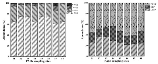 Among the 15 PAHs compounds, Phe had the highest average content, followed by Flu, Fla, Pyr, Ant. The composition of 3–6-ring PAHs in each station is shown in Figure 4. The contents of 3-ring PAHs were the highest among the eight rivers and flood discharge channels of ZJB, with 3-ring accounting for 60.5–75.2% of ΣPAHs, four-ring PAHs accounting for 21.5–33.6%, and 5–6-ring PAHs accounted for 1.1–15.0%. Among the six PAE compounds, DIBP, DBP, and DEHP were the main components, accounting for 28.4%, 19.9%, and 51.0% of the total PAEs, respectively, totaling 99.3%. Regarding the eight stations of PAEs, DEHP accounted for 43.7–62.7% of ΣPAEs, DIBP accounted for 21.7–36.8%, while DBP accounted for 14.1–27.2%. In general, 3–4-ring PAHs were the dominant components of PAHs, while DEHP was the most abundant PAE compound. The concentration of the three main PAEs was in the following order: DEHP > DIBP > DBP, with DEHP being the most abundant.