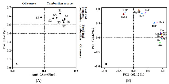 Characteristic ratios are commonly used to identify the source of PAHs. For example, a value of Ant/(Ant + Phe) < 0.1 indicates the petroleum sources, while a value >0.1 indicates the combustion source. A value of Fla/(Fla + Pyr) < 0.4 indicates the oil source, a value of 0.4–0.5 indicates the fossil fuel combustion source, and a value >0.5 indicates the coal and biomass combustion source [26,27]. Figure 5A shows the characteristic ratio of PAHs. The results indicate that S5 associated with the oil source, while the other estuaries have Ant/(Ant + Phe) > 0.1, indicating the combustion source. Additionally, Fla/(Fla + Pyr) values in all stations were >0.5, indicating the source of coal and biomass combustion. Principal component analysis was employed to further explore the source and contribution of PAHs [26,27]. Figure 5B shows the principal component analysis of PAHs, with the two principal components explaining a total variance of 89.75% (PC1: 62.12%, PC2: 27.63%). PC1 was primarily composed of Acy, Ace, Flu, Phe, Ant, Fla, Pyr, BaA, Chr for 3–4-ring PAHs with high load values, indicating sources related to low-temperature combustion such as coal and wood [28]. PC2 was mainly composed of BaA, BbF, BkF, BaP, IcdP, DahA, and BghiP for high-ring PAHs with high load values, indicating high-temperature combustion of petrochemical fuels [29].