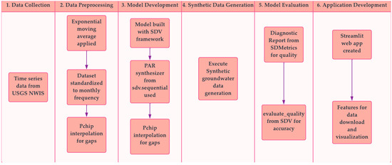 Despite the widespread use of synthetic time series data in various fields, there is a significant lack of research on generating synthetic data related to groundwater management [19]. This research paper aims to address this gap by presenting a novel method for generating synthetic groundwater levels using advanced ML techniques. The ability to generate realistic synthetic well data has the potential to significantly enhance the understanding and management of groundwater resources. This approach will enable the development of effective strategies for sustainable groundwater management and planning, even in regions constrained by limited observational data. Moreover, this approach will bolster the capacity of researchers to refine their current methods, improving the quantification of uncertainties, model validation, and calibration, leading to more informed decision-making in groundwater management (Figure 1).