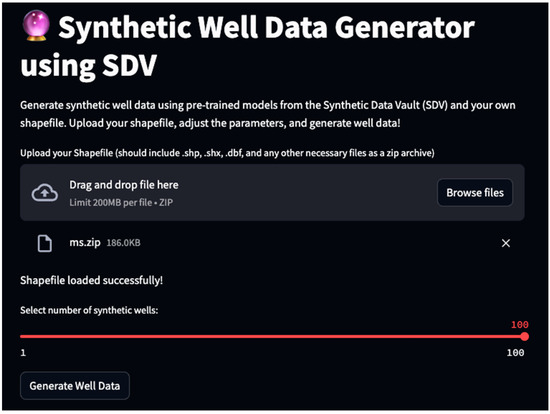 Screenshot of the Streamlit-based application. The GUI allows for drag-and-drop file uploading and selection of the number of synthetic wells in the output dataset.
