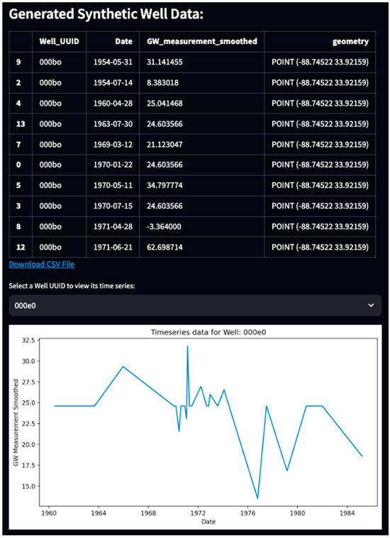 For added utility, the application provides options for downloading synthetic data and visualizing specific well time series data. These features, coupled with the app’s ease of use and the efficiency of Streamlit, make this web application a highly effective tool for researchers and practitioners in hydrology. Moreover, combining advanced data science tools with user-centric application design is vital, as this approach offers a comprehensive and accessible solution for analyzing synthetic time series data in groundwater studies.