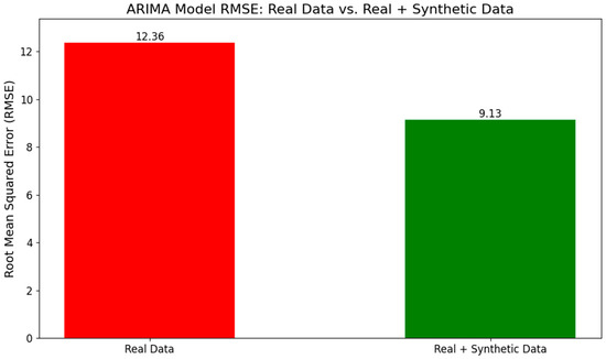 - Model training and evaluation: In this stage, two separate ARIMA models were developed and assessed. The first model utilized the merged dataset comprising both real and synthetic data, while the second model was trained exclusively on real data. These models were evaluated based on their root mean squared error (RMSE) performance, which provides a quantitative measure of forecasting accuracy.
