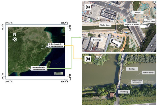 The study area of this research included some rivers in a coastal city and a developed city in southern China, as shown in Figure 1. The selected representative cities have developed water systems and high urbanization processes, and there is an urgent need for wide-area monitoring of the water environments. The water areas are located in the urban areas, and the rivers are long and narrow. The environment temperature is suitable and the nutrients are abundant, so there are weeds, islands, and other targets in the water bodies, and the environments around the shores are complex. The study area in Figure 1a includes a water body, buildings, a bridge, water surface flare, underwater interference targets, etc. In addition, the image of the study area in Figure 1b not only has the above-mentioned features, but also has a large number of water shadows, which easily interfere with the extraction of water, and then affect the accuracy of water extraction. Thus, it is appropriate to take these areas as typical study areas for water extraction, which can fully verify the universality of the water extraction method proposed in this paper.
