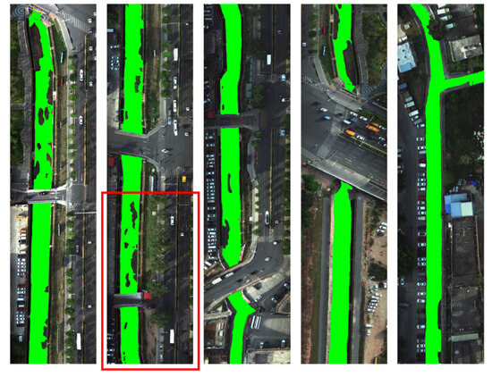 Based on the RGB images of a coastal city study area in southern China, the water area was manually marked with green to evaluate the accuracy of the water extraction model. The marked RGB images are shown in Figure 4, and the study area includes water bodies, vegetation, aquatic plants, buildings, roads, architectural shadows, and other typical features.
