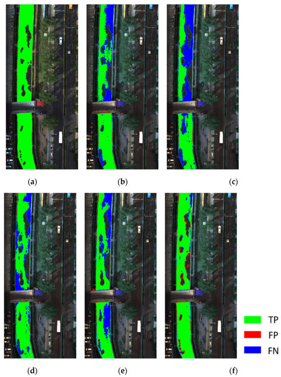 The images of water body extraction results of five algorithms were discussed, as shown in Figure 6. Figure 6a is the initial water mark image of this area, and the water area was covered with green. Figure 6b–f, respectively, show the results of water body extraction by several methods, in which the areas where TP correctly detects water body, FP false detection, and FN missed detected were marked with green, red, and blue, respectively, and the areas where TN correctly detects background were displayed with the initial RGB values of the image background.