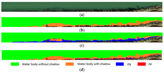 The water body and shadow extraction ability of the above-mentioned two methods were discussed by using some images with water shadow. Figure 8a shows the RGB images of some study areas with significant shadow problems. Figure 8b shows a manually marked water image corresponding to this part of the area, in which the green area is a water body without shadow, and the orange area is a water body with the shadow of trees on the shore or weeds at the bottom of the river. Figure 8c,d show the water body extraction effect images of the HDWI and PCA-NDWI models, respectively. The TP area, FP false detection area, and FN missed detection area are marked with green, red, and blue, and the TN area is displayed with the initial RGB value of the image background area.