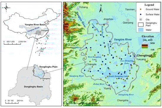 Dongting Lake, the second-largest freshwater lake in the Yangtze River Basin, is also a core water resource gathering area in the Dongting Lake Ecological and Economic Zone. Water resources have become the key resources for the green transformation and high-quality development of the Dongting Lake Ecological and Economic Zone. Under the influence of human activities and global climate change, flood disasters in the wet season and seasonal water shortages in the dry season are common, and ecology and environment are obviously degrading in Dongting Lake Plain []. These conditions greatly restrict the socioeconomic development and ecological protection of the Dongting Lake Plain. Thus, there is an urgent need to ascertain the sources of water resources and the interaction relationship between groundwater and surface water to identify effective solutions. In the past, the Dongting Lake Plain mainly focused on the dynamic analysis of water storage [,,], the exchange of Dongting Lake water with the Yangtze River [,], and the discharge and material migration of groundwater in the lake plain [,]. However, there has been relatively little research on the relationship and feedback between groundwater and surface water. To this end, this article analyzes the hydrogeological conditions and groundwater movement in the Dongting Lake plain and explores the interactions between groundwater and surface water by means of water chemistry and isotope methods to provide support for the development and utilization of water resources and protection and restoration of the ecological environment in the lake plain.