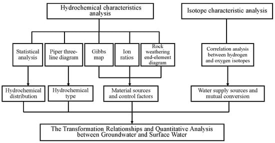 ArcGIS10.5 was used to compile the location map of the study area and deployment diagram of the sampling points; SPSS22.0 was used to carry out the descriptive statistical analysis of the water quality data; and the minimum, maximum, mean, standard deviation, and coefficient of variation for the main ionic components of the groundwater and surface water samples were also carried out. The characteristics and differences of the statistical values can reveal the hydrochemical distribution characteristics and spatial differences from different water sources by simultaneously combining the significant correlations between ions from different water sources to identify mutual correlations [,]. In order to explore the interactions between groundwater and surface water, Aqua Chem 9.0 software was used to draw a Piper trilinear diagram, Origin 2018 software was used to draw Gibbs diagrams, ion–ratio relationship diagrams, rock-weathering end-element diagrams, and hydrogen–oxygen isotope diagrams, as well as to analyze the sources of recharge and the controlling factors for chemical elements in groundwater and surface water. The research methods and technical ideas are shown in Figure 2.