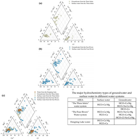 Piper three-line diagram of groundwater and surface water in Dongting Lake Plain: (a) Piper three-line diagram in “the Three Inlets“ water system; (b) Piper three-line diagram in “the Four Rivers“ water system; and (c) Piper three-line diagram in lake area water system.