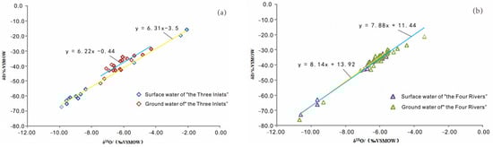 δD and δ18O of surface water in “the Three Inlets” water system area range from −15.7 to −67.2 and −2.07 to −9.87, respectively; δD and δ18O of groundwater range from −28.6 to −51.4 and −4.28 to −7.44, respectively; δD and δ18O of surface water in “the Four Rivers” water system area range from −34.4 to −72.9 and −5.62 to −10.6, respectively; δD and δ18O of groundwater range from −21.1 to −76.2 and −3.4 to −10.68, respectively; and δD and δ18O of Dongting Lake water range from −19.5 to −73.8 and −2.93 to −11.05, respectively. In the Dongting Lake Plain, the groundwater and surface water samples are mainly located near the LMWL, and the slope of the local evaporation line in the Dongting Lake Plain is less than that of the LMWL, which indicates that atmospheric rainfall is an important source of recharge for groundwater and surface water and is also affected by evaporation to a certain extent.
