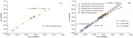 δ 18O- δ D correlation diagram of groundwater and surface water in Dongting Lake Plain. (a) “The Three Inlets” water system; (b) “the Four Rivers” water system; (c) Dongting Lake water; and (d) lake area water system.