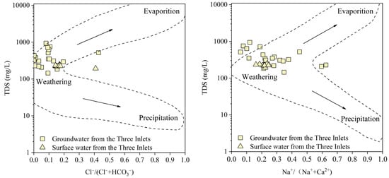The Gibbs model [], which considers the different types of ions and concentrations in rivers, lakes, and oceans, highlights the influence of the chemical characteristics of natural water bodies based on the mechanism, namely, evaporation–crystallization, rock weathering, and atmospheric precipitation, as a direct way to distinguish the controlling factors of hydrochemistry. The Gibbs diagram of the groundwater and surface water in “the Three Inlets” and “the Four Rivers” water system areas and Dongting Lake water (Figure 5, Figure 6 and Figure 7) reveal that the equivalent concentrations of groundwater and surface water in the Dongting Lake Plain are relatively concentrated and are mainly located in the rock weathering area, indicating that the ion sources are mainly affected by rock weathering and dissolution. Some water samples from “the Three Inlets” water system area and Dongting Lake are inclined towards the evaporation and concentration areas, indicating that the ion sources are evaporation and concentration, in addition to the dominant rock dissolution. On the one hand, water samples from “the Three Inlets” water system area were dominantly collected from shallow water, and strong evaporation occurred in the area. On the other hand, for the surficial river water in “the Three Inlets” water system area, the Dongting Lake water is exposed at the surface, and direct evaporation of the water body occurs, and for the surface water in “the Three Inlets” water system area, groundwater performance depends on a similar ion source mechanism. These findings indicate that the two have a certain transformation relationship, and at the same time, direct drainage of groundwater into Dongting Lake occurs. “The Four Rivers” water system area is partially biased toward atmospheric rainfall (Figure 6); the source area of “the Four Rivers” has a high depth of groundwater in the terrain, the effect of evaporation is weak, and the ion sources of groundwater are dominated by the natural weathering of rocks, and the surface water receiving atmospheric rainfall is controlled by certain atmospheric rainfall effects. Meanwhile, the ion sources of groundwater and surface water in “the Four Rivers” water system area are mainly dominated by the natural weathering of rocks, indicating that groundwater is likely to mix and replenish surface water. Some of the groundwater samples in the Dongting Lake Plain plot outside the dotted line delineating the control area (Figure 7), and it is hypothesized that these samples may be influenced by other factors, such as cation exchange and human activities [].