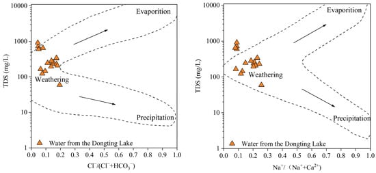 The ion sources of groundwater and surface water in the Dongting Lake Plain are dominated by the dissolution effect caused by rock weathering. Combined with the relationships between the ratios of Ca2+/Na+, Mg2+/Na+, and HCO3−/Na+, the dominant type of rock weathering can be further identified [,]. The ion end-element map (Figure 8) shows that surface water in the Dongting Lake Plain is mainly present within the carbonate and silicate rocks end of the distribution, indicating that surface water in the lake plain is affected by the weathering of carbonate and silicate rocks, mainly because “the Four Rivers” basin is located in the mountainous bedrock area where carbonate rocks and granite are distributed; these basins include Wuling–Xuefeng and Nanling–Luoxiao. In the mountainous bedrock area, the products of bedrock weathering and dissolution infiltrate groundwater within the water chemistry system. In “the Three Inlets” and “the Four Rivers” water system areas, groundwater is mainly present within the carbonate and silicate rocks end of the distribution; it is scattered around the surface water, with a numerical range greater than that of the surface water. Groundwater and surface water exhibit a close hydraulic relationship, and groundwater recharges surface water. Moreover, groundwater also undergoes dissolution of evaporite saline, and an ion exchange occurs in the process of migration along the way or exchange with surface water. Additionally, the mechanism of evaporation is rarely observed in surface water.