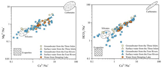 Mg2+/Na+, HCO3−/Na+, and Ca2+/Na+ ratios of groundwater and surface water in Dongting Lake Plain.