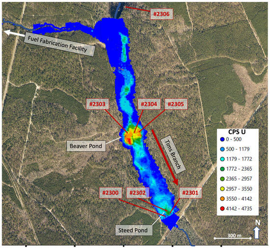 Sampling locations identified on a heat map of U concentrations (counts per second, CPS; map based on data from Kaplan et al. [23]) of the Times Branch wetland, Savannah River Site (SRS). The U and Ni sources (Fuel Fabrication Facility), the upstream sediment sample (#2306), and the contaminated sediment samples (#2300–#2305) are noted. The heat map shows the spatial distribution of U activity in Tims Branch, especially showing the high concentration of U in Beaver Pond (1772 to 4735 CPS U) and Steed Pond (1772 to 2957 CPS U). The U activity on the heat map was determined from the gamma radiation produced by 234mPa (a daughter product of 238U, corrected for background) in >700,000 gamma spectra.