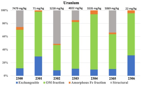 Total U concentrations were significantly and positively correlated with OM concentrations (r = 0.786, p ≤ 0.05, Table 2), corresponding with the large organic-bound U fraction (Uorg) (Figure 2) and the significant correlation between Uorg and OM (r = 0.831, p ≤ 0.05, Table 4). Significant OM correlations also existed for the operationally defined organic-bound Ni (r = 0.834, p ≤ 0.01, Table 4), while no correlation was observed between the total Ni and OM due to the low contribution of the Niorg fraction to the total Ni pool. Given the significant negative correlation between pH and OM (r = −0.906, p ≤ 0.01, Table 2), the negative correlation of pH with total U (r = −0.790, p ≤ 0.05, Table 2), the negative correlation of pH with organically bound U, and the negative correlation of pH with organically bound Ni can be expected (r = −0.809 for Uorg and r = −0.822 for Niorg, p ≤ 0.05; Table 4 and Figure S2).