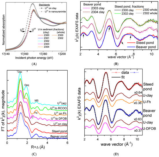 The U EXAFS data obtained from the sediments are shown in Figure 3B. The four spectra from Steed Pond samples (sites #2300 and #2302, as whole sediments and as clay fractions) overlay each other, which indicates the same U(VI) speciation averaged over all of the U atoms in the sediment at this site, regardless of size fraction. The spectrum from #2301 was of significantly lower quality due to the lower U concentration (Table S4) and was not used. The two spectra from the Beaver Pond sediments (# 2303 and #2304) also overlay each other, indicating the same U(VI) speciation within that location. Comparisons between the averaged spectra from Steed Pond and Beaver Pond show small but consistent differences at the two sites (see arrows in Figure 3B). The corresponding differences in average U(VI) speciation are quantified in linear combination fits (see below). The Fourier transform (FT) of the data is shown in Figure 3C and consists of a main peak at R + Δ = 1.3 Å corresponding to the axial oxygens in the uranyl cation, a shoulder around R + Δ = 2.2 Å resulting from the equatorial O coordination, and a smaller peak around R + Δ = 2.8 Å corresponding to multiple-scattering (MS) contributions from the axial oxygens potentially overlaid by contributions from complexing atoms such as Fe or P atoms at the surface of a mineral or from a phosphate ligand [30,31,58,59]. No peaks are observed at larger distances in the FT, indicating that U(VI) in the sediment did not precipitate as a U(VI) mineral [60].