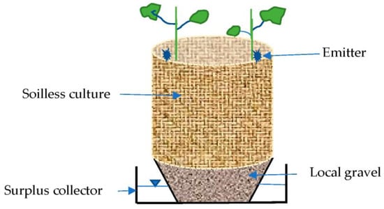 In this study, the HSless was an open system where water and nutrients were supplied as in the conventional soil culture, but the surplus of the water and nutrients (about 15%) was manually collected and reused. The soilless culture of the HSless was made up of peat moss, humin-substrate, and perlite in the ratio of (4:3:1.5). Peat moss is capable of absorbing 16 to 36 times its dry weight, has a low pH range from 3.4 to 4.8 and a high porosity of more than 95%. The humin-substrate contained many humic acids and was characterized by high water absorption capacity. Perlite is a natural inorganic mineral used as a hydroponic medium; it stimulates root growth and helps drain excess water. The HSless cultivation plot consisted of 32 pots (20 L) perforated from the bottom and placed in receptacles for surplus collection. Local gravel was loaded up to 10 cm into each pot, then an equal amount of soilless culture was placed on the gravel, as shown by the plot sketch (Figure 1).