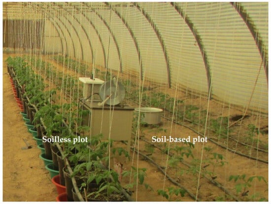 Tomato (Solanum lycopersicum Mill.) is one of the widely cultivated and highly consumed vegetable crops globally, particularly in semi-arid regions []. Tomato cultivation in the Mediterranean region necessitates a high water supply and significant fertilization demands. Studies have shown that hydroponically-grown tomatoes exhibit nutritional benefits compared to conventionally soil-grown counterparts []. Greenhouse tomato cultivation in Saudi Arabia accounts for nearly 50% of the country’s total tomato production []. Sandy soils dominate the majority of cultivated areas in Saudi Arabia, rendering them susceptible to water scarcity []. Therefore, employing alternative water-saving techniques is imperative to improve water use efficiency in tomato production in the Kingdom [].