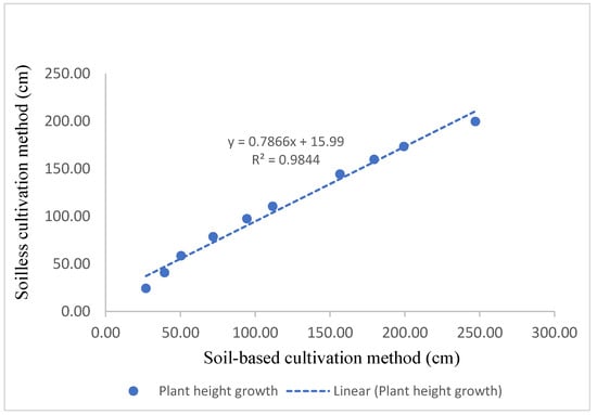 The study’s findings indicate a strong linear relationship between the average plant height growths in the two cultivation methods (Figure 4). The coefficient of determination (R2) of 0.98 suggests that the plant height growth for the two cultivation methods was nearly identical. This implies that approximately 50% of irrigation water could be saved by employing the HSless cultivation method instead of the CSbased cultivation method in greenhouses with homogenous sandy soil profiles.