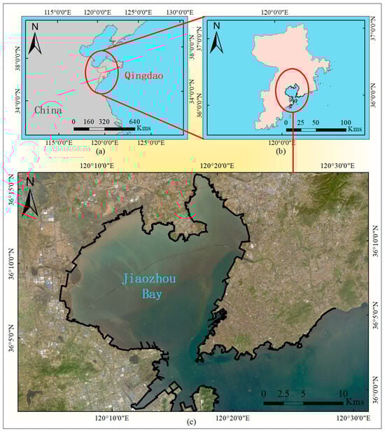 Map of Jiaozhou Bay. (a) Showing the location of Qingdao within China, (b) a closer view of the Qingdao region in Shandong province, and (c) a detailed satellite image of Jiaozhou Bay and its surrounding areas.