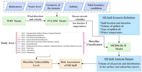 To effectively mitigate the potential impacts of oil spills, it is essential to conduct comprehensive risk assessments. These evaluations measure the potential impacts on marine and shoreline resources and estimate the likelihood of negative incidents []. By identifying vulnerable areas and resources at risk, risk assessments help prioritize prevention and response efforts []. Furthermore, they provide valuable insights for developing targeted strategies to minimize the consequences of oil spills, such as implementing stricter safety measures in high-risk zones or establishing contingency plans for sensitive habitats []. Comprehensive risk assessments are crucial for strengthening oil spill response measures and enhancing the overall resilience of marine environments to oil spill incidents. The oil spill risk assessment (OSRA) integrates the likelihood of oil spill incidents with an analysis of the potential consequences [,,]. The probability of an oil spill incident is commonly derived from historical data, while the potential consequences are primarily determined by the hazard posed to the region from an oil spill and the vulnerability of the ecological resources that could be affected. The hazards associated with an oil spill affecting a region can be assessed using oil spill models. Widely used oil spill models include Automated Data Inquiry for Oil Spills (ADIOS), General NOAA Operational Modeling Environment (GNOME), and Oil Spill Contingency and Response (OSCAR). These models incorporate various factors, such as ocean currents, wind patterns, and the properties of the spilled oil, to predict the trajectory, fate, and potential environmental impacts of oil spills. Numerous studies have successfully applied different oil spill models, demonstrating their effectiveness and versatility in diverse geographical settings. For instance, Valis et al. utilized selected mathematical functions to analyze operation data information, enhancing the accuracy of oil spill predictions []. Similarly, a recent study published in Water provided insights from diverse environmental studies, highlighting the importance of considering water resources and resilience in oil spill risk assessments []. Moreover, Spaulding conducted a comprehensive review of oil spill modeling, discussing the state-of-the-art techniques and future directions in this field []. The review emphasized the significance of incorporating environmental factors and the advancements in oil spill modeling approaches. Amir-Heidari and Raie developed a decision support system for oil spill response planning in the Persian Gulf, employing a form of consequence modeling that considers various environmental factors []. Their study demonstrated the effectiveness of this approach in predicting oil spill impacts and supporting decision-making processes. In a comparative risk assessment study, French-McCay et al. applied oil spill modeling to evaluate the effectiveness of different spill response options for a deepwater oil well blowout. The study highlighted the importance of considering environmental factors and the role of modeling in supporting decision-making during oil spill incidents []. Furthermore, Guo et al. conducted a numerical simulation of oil spill trajectory and diffusion in the Bohai Sea, taking into account various environmental factors, such as ocean currents and wind patterns []. When reliable predicted results are obtained from oil spill models, the zones where oil spills have the potential to harm marine ecosystems can be identified. When evaluating the vulnerability of coastal regions to oil spills, the Environmental Sensitivity Index (ESI) map, developed in accordance with guidelines from the National Oceanic and Atmospheric Administration (NOAA), serves as a foundational tool. By classifying shoreline types based on a set of criteria that include their pollution sensitivity, biological productivity, and patterns of human activity, the ESI map offers a detailed analysis of the varying degrees of risk across coastal regions, from the least to the most vulnerable to damage from oil spills. The utilization of the ESI map enables the strategic prioritization of areas that are significantly at risk, thereby enhancing the efficacy of oil spill response initiatives, and has achieved global application [,,]. Integrating the ESI with simulations of oil spill trajectories enhances the understanding of potential impacts on fragile environmental resources and facilitates the precise identification of risk-prone areas.