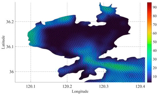 The numerical model’s unstructured grids extend across the entirety of the Bohai Sea and Yellow Sea. These grids comprise 104,250 nodes and 203,529 triangular sections, covering a vast expanse of approximately 446,500 square kilometers. Within these grids, Jiaozhou Bay’s geographical bounds are precisely defined, spanning from 120°10′ E to 120°46′ E longitude and 35°35′ N to 36°18′ N latitude, as illustrated in Figure 4, making it a distinct feature of the Yellow Sea region. Located along the southern shores of the Shandong Peninsula, the bay is characterized by an average depth of about 7 m.