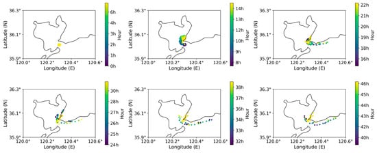 Based on the established models, a series of simulations, each with a unique origin point for the oil spill incident, were generated to illustrate the potential trajectories and dispersion patterns of oil spills under varying conditions. For the scenarios at Dagang Port and Horseshoe Reef, the simulations reveal minimal movement over a 48 h period. At Dagang Port, the simulation shows the oil spill remaining nearly stationary, close to its point of origin, throughout the 48 h period. This suggests that the spill’s natural dispersal is impeded by environmental conditions or physical barriers, such as natural shallows or man-made structures. The observed lack of movement might also be due to the high level of cohesion among the oil particles, which prevents the spill from spreading, as would typically be expected. Similarly, the scenario at Horseshoe Reef demonstrates a tendency to move towards the shoreline over the course of 48 h. Initially, the oil maintains its proximity to the point of origin. As time advances, particularly between the 13th and 22nd hour, there is a gradual but definite displacement of the oil closer to the coast. This suggests the influence of coastal currents and possibly the topography of the seabed directing the spill’s trajectory. By the 30th hour, the simulation shows an increased concentration of oil towards the land, indicating sustained movement in that direction. As the simulation approaches the 46th hour, the oil’s reach extends further along the coastal boundary. This movement suggests a consistent drive towards the coast, shaped by environmental currents and seabed contours. In contrast, the subsequent scenarios presented in Figure 5, Figure 6 and Figure 7 show marked differences in the dispersion patterns, showing notable movements of oil spills from the initial spill moment (t = 0) up to 48 h. These visual representations, marked at eight-hour intervals, provide a depiction of how the oil spills evolve over time, offering insights into the influence of different spill origins on the dispersion trajectory.