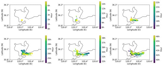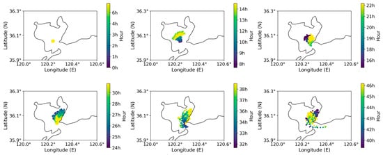 As shown in Figure 6, the oil spill from Huangdao Oil Port exhibits distinct behavior over a 48 h period. Initially, the dispersion is limited, with the oil remaining concentrated near the port. From 8 to 16 h, there is an unexpected movement toward the north, which may be due to local currents or winds impacting the spill’s path. As the simulation advances beyond 16 h, a gradual shift towards the southeast becomes evident, suggesting that the wind or currents might have changed direction. By the 32 h point, the southeastward movement is clear, and the oil’s dispersion across the water’s surface becomes more widespread. Towards the end of the simulation, from 40 to 48 h, the oil has been drifting for a substantial amount of time and covered a more extensive area.