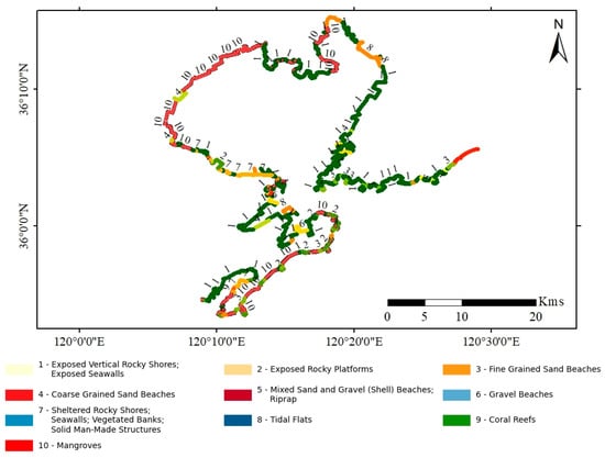 Following the guidelines set by NOAA and illustrated in Table 3, an Environmental Sensitivity Index (ESI) map was made for the study region, showing shoreline variations as depicted in Figure 8. This ESI map differentiates shoreline types using distinct color codes to represent each ESI category. Analysis reveals that the coastline of Jiaozhou Bay encompasses ten of NOAA’s shoreline classifications.
