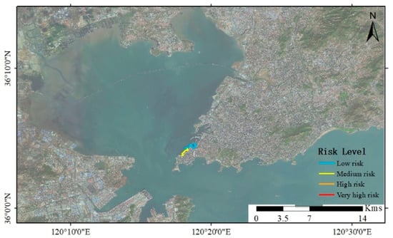 The comprehensive risk assessment conducted for oil spills originating from three distinct points—Horseshoe Reef, Huangdao Oil Port, and Qianwan Port—has produced detailed risk zoning maps, as shown in Figure 9, Figure 10 and Figure 11. These maps, characterized by color-coded risk levels, provide a visual representation that delineates areas across the study region under varying degrees of risk, from low to very high. This layered approach to risk evaluation, integrating ESI ratings with projected oil spill movements, enhances our understanding of the potential environmental consequences. The structured analysis is presented in Table 2.