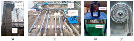 Model site layout. (a) The layout of water towers, return pipes, and outlet pond. (b) The layout of pumps, outlet pipes, and electromagnetic flowmeter. (c) Torquemeter and centrifugal pump. (d) Centrifugal pump. (1#–7# is the pipe number).