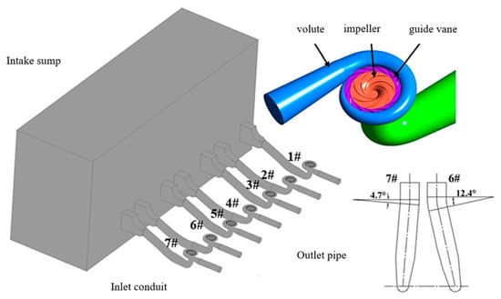 Geometric model of the model pumping station. (1#–7# is the pipe number).