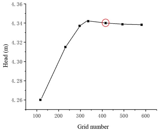 The hexahedral mesh is used in this study to mesh each flow pump component to select the appropriate number of meshes that can guarantee the calculation accuracy and avoid the slow calculation speed. Under the design condition, with the pump head as the judgment index, the centrifugal pump unit section (including the intake sump, inflow runner, impeller, guide vane, spiral casing, and outlet pipe section) for a single unit of the mesh-independent verification calculations is shown in Figure 4. The figure reveals that the change in pump head amplitude is small and stable when the number of grids is 3.2 million in terms of the calculation cycle and the calculation capability. Finally, the number of grids is 4.26 million to complete the calculation after the grid distribution of various parts of the overcurrent, as shown in Figure 5.