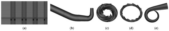Grid schematic diagrams of each flow pump component. (a) Forebay grid; (b) inflow runner grid; (c) impeller grid; (d) guide vane grid; and (e) volute grid.