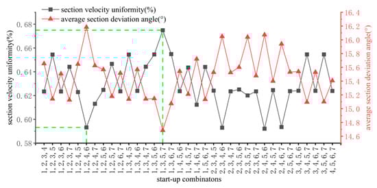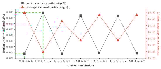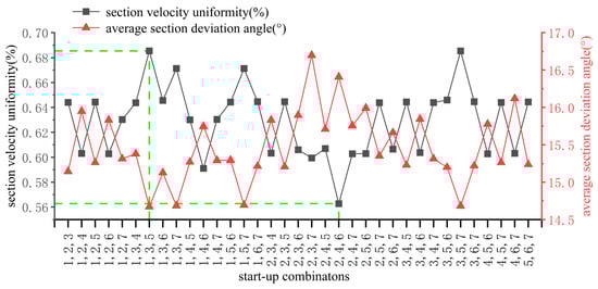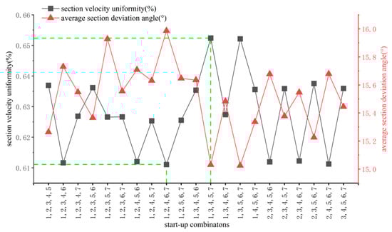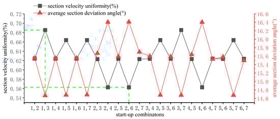 Uniformity of flow velocity and average section deviation angle distribution of cross-section for different start-up combination schemes. (The dotted line represents the coordinates of the point).