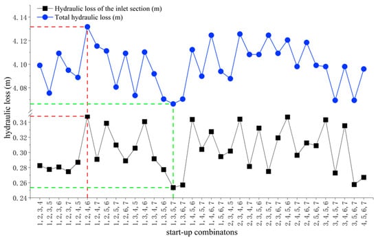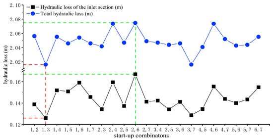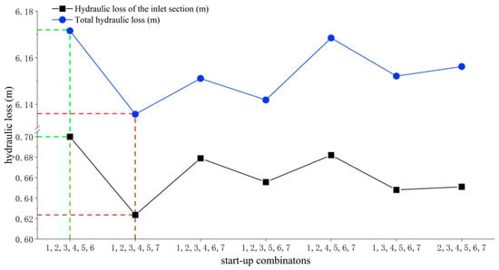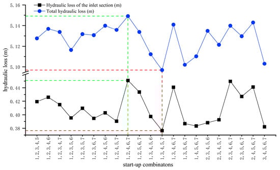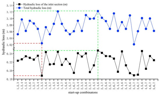 All the start combination conditions are simulated in this paper during the operation of six units. Figure 24 shows the specific start combination scheme and the calculation results. Meanwhile, Figure 25 shows the distribution of hydraulic losses in the inlet section of the pumping station and the total hydraulic losses during the operation of the six units.