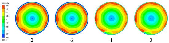 Figure 8 shows the cross-section flow velocity distributions for the worst startup combination for units 2 and 6 and the best startup combination for units 1 and 3. Under the operating conditions of the two units, the following conditions are observed. When the inlet runner is switched on to the left of the unit, the corresponding flow velocity distribution area is average. When the inlet runner is switched on to the right of the unit, the flow velocity near the wall changes abruptly (high flow velocity is suddenly reduced to 0), and a large area of low-speed zone emerges at the wall, which is prone to cause water disturbance and induces an unstable flow, resulting in the emergence of vortex and increasing hydraulic losses. Differences in the flow state in the intake pipe will inevitably lead to variations in energy distribution within the pump.