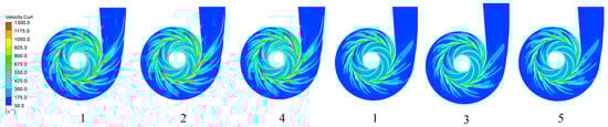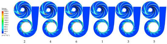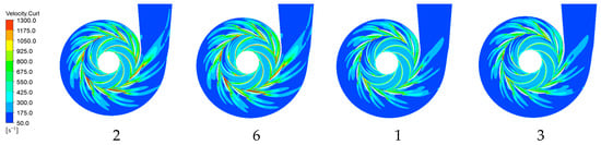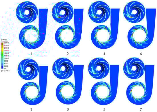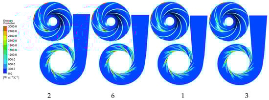 Figure 18 shows the characteristic cross-section flow velocity distribution cloud plots for the worst startup combination, opening units 1, 2, 4, and 6, and the optimal startup combination, opening units 1, 3, 5, and 7. The characteristic cross-section flow velocity maps indicate the following: when the four units are operated, the corresponding flow velocity distribution area is better when the unit with the inlet runner to the left is switched on than when the unit with the inlet runner to the right is switched on. Compared with switching on three units simultaneously, no change in the flow uniformity in the characteristic section is observed when four units are simultaneously switched on. Figure 19 shows the entropy production distribution cloud diagram of the middle section of the main overflow parts (impeller, guide vane, volute) of the centrifugal pump with the optimal and worst combinations when four units are simultaneously switched on.