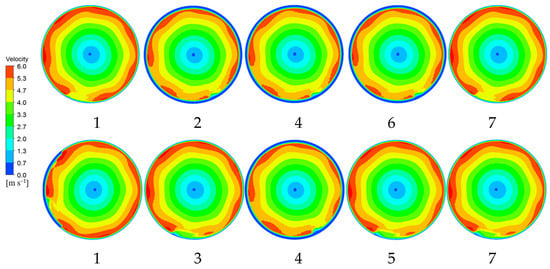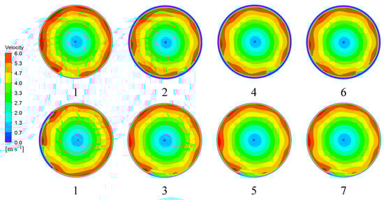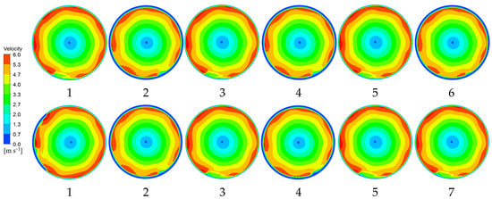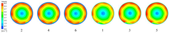 Figure 26 shows the characteristic cross-section flow velocity distribution cloud diagrams for the worst start combinations for switching on units 1, 2, 3, 4, 5, and 6 and the optimal start combinations for switching on units 1, 2, 3, 4, 5, and 7. The characteristic cross-section flow velocity map reveals that when the six units are running, compared with the previous conditions, the flow velocity uniformity of the pump inlet cross-section and the average cross-section deflection angle do not demonstrate substantial changes. The cross-section cloud map is also maintained. Overall, when switching on the six units, priority is given to switching on units 1, 2, 3, 4, 5, and 7.