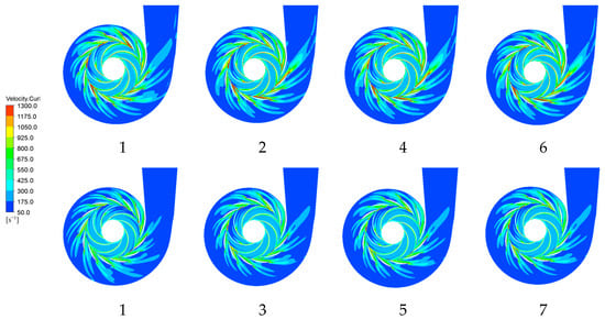 Compared with the case when two and three units were simultaneously switched on, the vortices in the overflow components were reduced when four units were simultaneously switched on. This phenomenon is consistent with the distribution of the entropy production values, indicating that the flow inside the centrifugal pump was more uniform when four units were simultaneously switched on than when two and three units were simultaneously switched on. Figure 20 shows that the worst combination for high vorticity area is more evident than the optimal combination. Overall, when four units must be switched on, priority is given to switching on units 1, 3, 5, and 7.