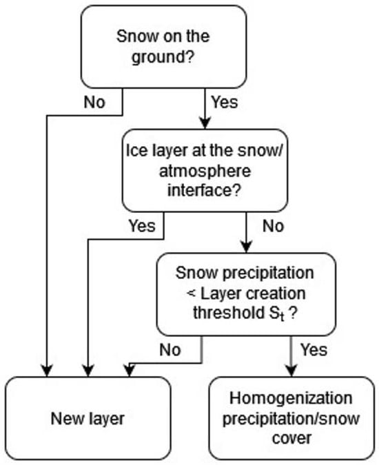 Any snowfall in the absence of snow on the ground or above a pure ice layer (layer with a density of 917 kg.m−3) leads to the creation of a new layer with a specific mass and heat deficit. If these criteria are not met, and if the snowfall water equivalent is less than a threshold value St, then the incoming mass and heat deficit are incorporated into the current layer at the air–snow interface. Otherwise, a new layer is established, as illustrated in Figure 1. St serves as a calibration parameter, allowing for concurrent optimization of energy transfers and restricting the number of layers. Some energy transfer processes solely affect specific layers. For instance, heat input from the ground solely influences the layer at the ground–snow interface, while radiation exclusively warms up the layer at the air–snow interface. For the latter layer of the monolayer model, heat loss through conduction and heat gain via radiation are enabled when the air temperature is below or above the melting threshold temperature T0, respectively. Furthermore, in instances where melting exceeds the water retention capacity, excess water seeps into the underlying layer at a temperature of 0 °C. Excess heat is used for phase change; if the uppermost snow layer has undergone a phase change, any residual heat is then transferred downwards. Consequently, the energy balance can be expressed using Equations (9a)–(9c) for the top layer, any intermediate layers, and the bottom layer, respectively.