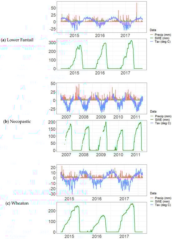 The weather and SWE station metadata are provided in Table 2. During the study, ground-based precipitation measurements were non-continuous in Yukon. Given these conditions, the precipitation times series for modeling was assumed to be the daily increase in observed water equivalents due to the lack of information about wind-related snow transport. The modeled SWE was compared to data from the GMON stations, which measure gamma rays naturally emitted by the Earth and attenuated by the snowpack. The measuring principle, developed by Choquette et al. [], converts gamma radiation measurements into SWE (mm). The station sensors at Necopastic and Upper Yukon are GMON3 [] and CS275s [], respectively, with measurement uncertainties ranging from ±15 mm (for SWE less than 300 mm) to ±15% otherwise. Figure 3a–c depict precipitation, average air temperature, and SWE time series at the three stations. The evaluation of model performance excluded days without SWE data.