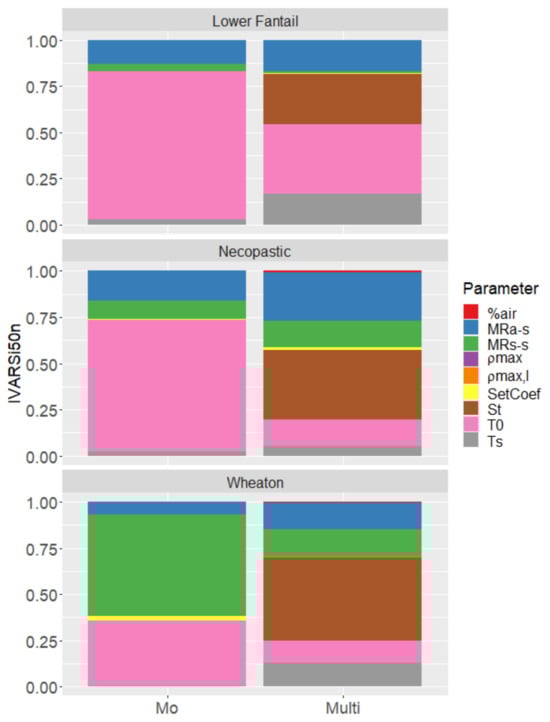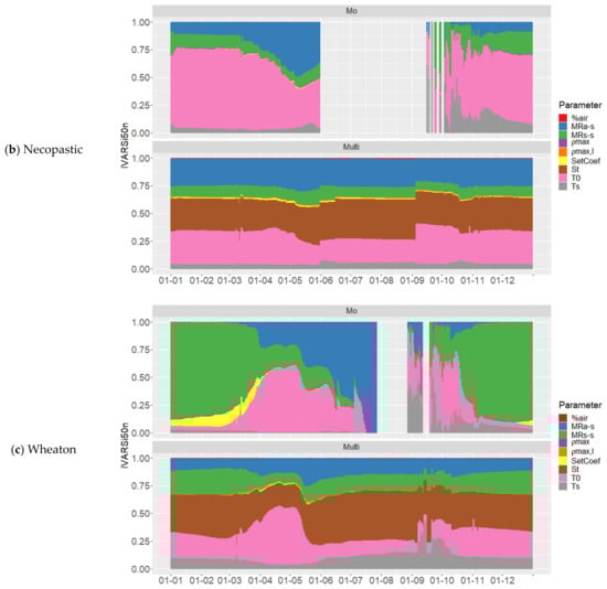 The sensitivity analysis was conducted for the three stations. Figure 4 depicts the relative sensitivity index for each parameter for both models.