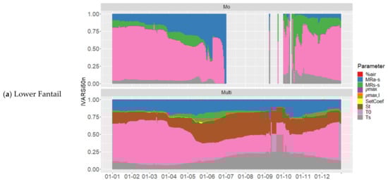 Before comparing parameter sensitivity differences between the two models, it is necessary to evaluate those of the three additional parameters of the Multi snow model. Notably, , the new snow layer precipitation threshold, displayed high sensitivity and requires calibration, while and %air exhibited minimal sensitivity values and could therefore be set to a constant value prior to calibration. Both Dahe et al. [] and Nishimura et al. [] observed a maximum value of 550 kg.m−3 for . Considering its sensitivity and range of values set at 250–550 kg.m−3 in the Mo model, it was set to 550 kg.m−3 for the Multi model. As for %air, it was established as 10% of the snowpack depth in the Mo model. In the multilayer model MASiN [], it was set at 8% of the volume of the snowpack not occupied by the SWE or the liquid water content, with some allowance possible for values varying between 5 and 10%. Würzer et al. [] set a value of 3.5% of the snow depth in the SNOWPACK model. Taking these divergent values into account, %air was set at 10% of the snowpack height occupied by air in the Multi model.