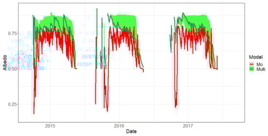 Albedo time series modeled by the top ten best sets of parameter values for the Mo model (pink envelop) and the Multi model (green envelop) for the (a) Lower Fantail and (b) Necopastic GMON stations. The best parameter sets are depicted by the red and green lines for the Mo and Multi models, respectively.