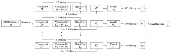 Multiple BoostTrees were integrated into a forest by using Weighted BoostForest (En-WBF). Prior to obtaining the final prediction outcome by weighting (see Equation (3)), the proposed En-WBF approach firstly sampled K training subsets using bootstrap. Next, it trained a BoostTree on each sampled subset. Finally, it input each validation set into the trained BoostTree to produce the weight of each base learner.